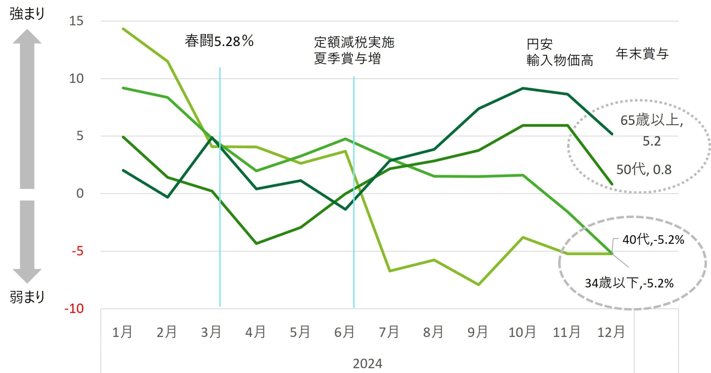 次に、節約志向は世代によって二極化してきた点が見て取れる。図表3に示すように、34歳以下は消費に積極的となり、40代の節約志向も薄まってきた。反対に、50代および65歳以上の節約志向は依然としてプラスの水準である。春闘が妥結した3月と、一般的な夏季賞与の時期である6、7月の少し後、そして直近12月に、トレンドが大きく変化している。