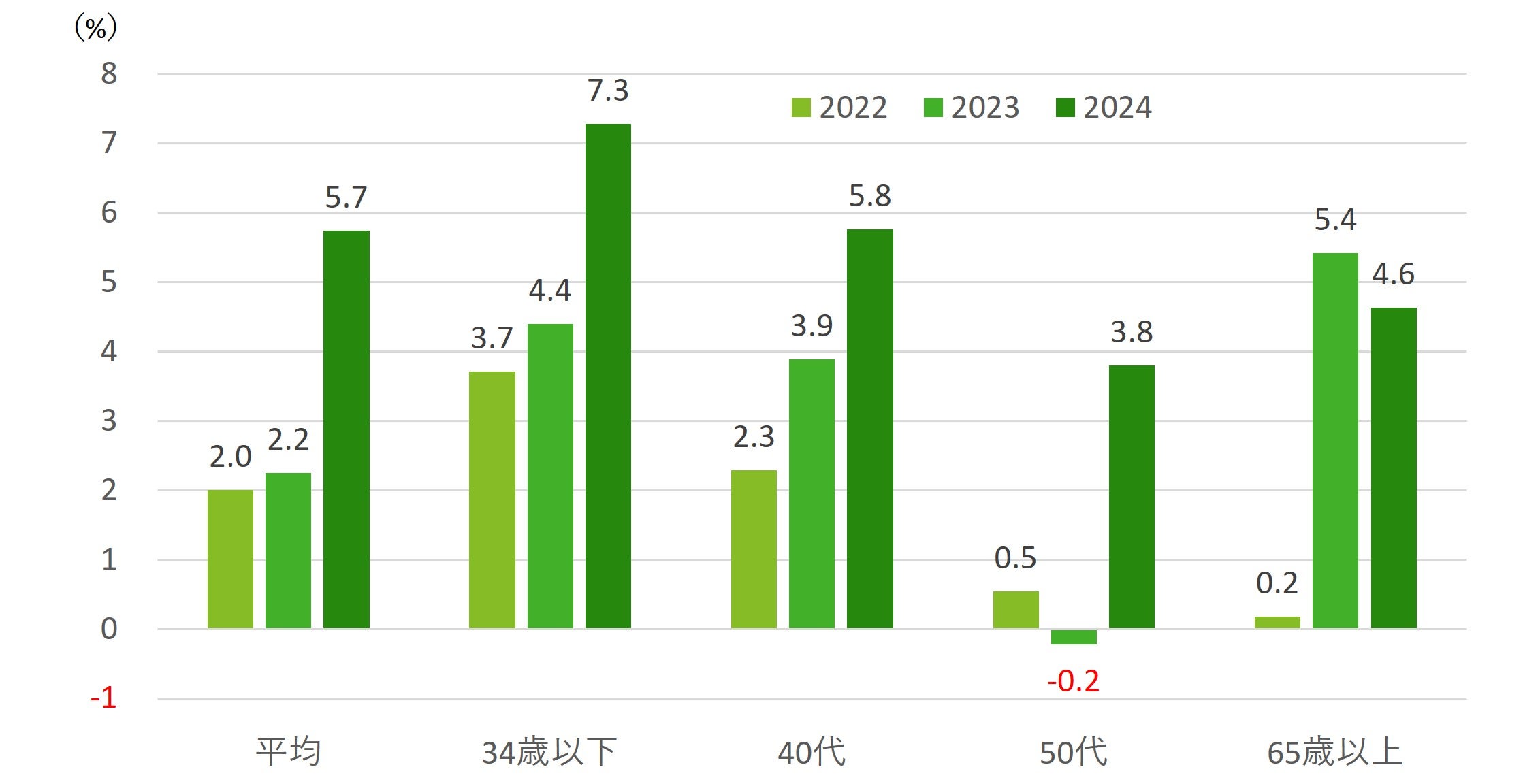 こうした二極化が生じた背景として、世代間で賃上げの恩恵に格差が生じたことが挙げられる。図表4で示すように、新卒社員の初任給引き上げや、2024年の賃上げの恩恵に被ったのは主に若年層であった。物価上昇局面に入る前の2021年と比べると、2024年の実質可処分所得は34歳以下で7.3%増えた。40代の可処分所得も、34歳以下ほどではないものの、この間、伸びを続けている。半面で、50代は賃上げの恩恵に浴すのが遅れ、2023年はマイナス0.2%にとどまり、2024年に入ってようやく3.8%増となった。