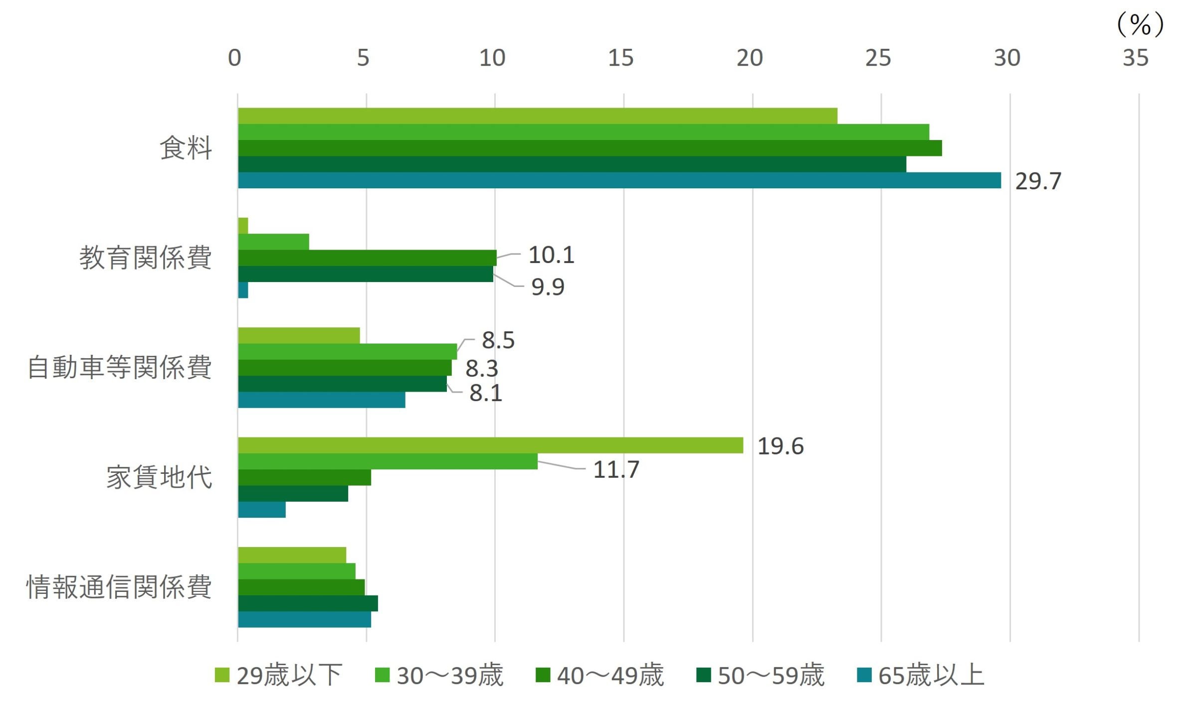 世代ごとに家計の重しがどこにあるのか、図表5で総世帯をベースに支出特性を検討した。65歳以上の支出傾向については、家計に占める食品の割合が30%に達する水準で、ほかの世代より高く、物価変動の影響を受けやすい。40代および50代は、子どもの学費負担にかかる教育関係費がそれぞれ、10.1%、9.9%を占めており、消費意欲を不安定にさせている。また、20代、30代の若年層については、住宅取得前の世帯を中心として地代家賃負担が高い。このほか、ガソリン代をはじめとする自動車等関係費と、携帯電話料金を中心とする情報通信費の割合は、概ねどの世帯でも5~10%弱となっている。