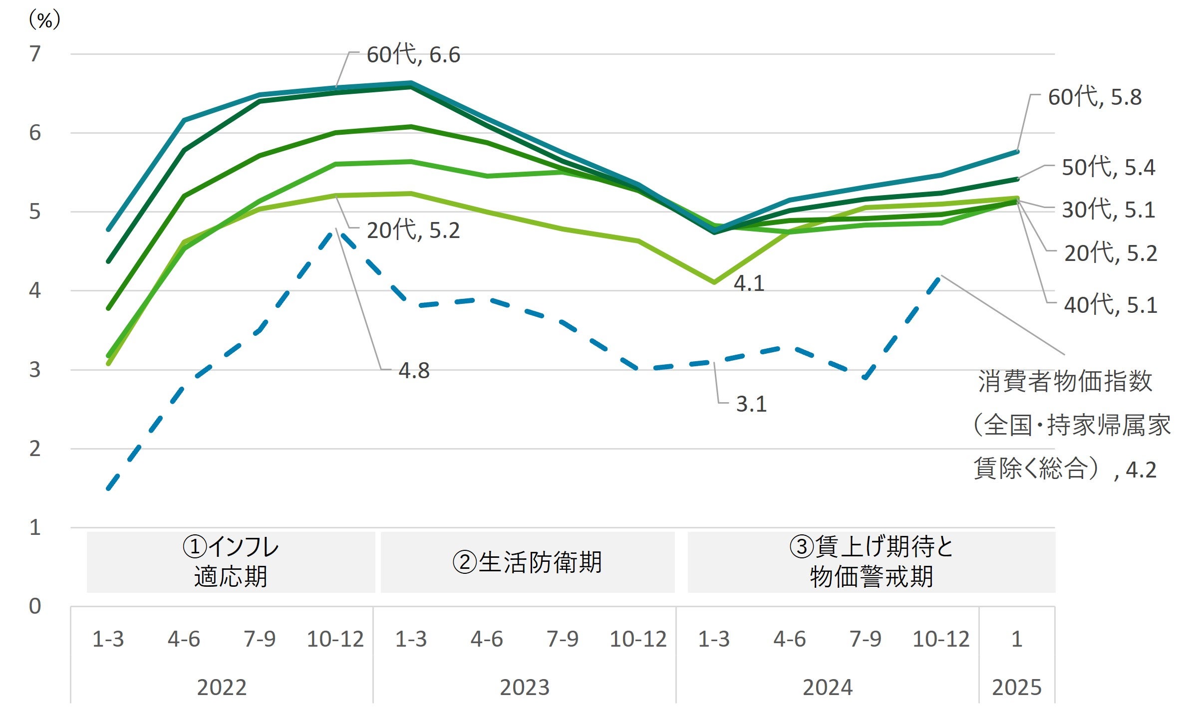 消費者が所得増の恩恵を実感しうる水準を探るために、図表6では消費動向調査「二人以上世帯の物価見通し」年齢階級別アンケートに基づき、人々が実感している物価上昇率である「体感物価」の各世代平均値を算出した。2022年のインフレ適応期から直近の賃上げ期待と物価上昇を警戒する局面に至るまで、体感物価は概ね5%~6%後半で推移してきた。この水準は、同時期の消費者物価指数(全国・持家帰属家賃除く総合)よりも1~2%程度高くなっている。