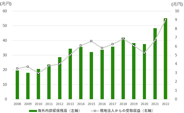 2000年代以降、海外に進出した日本企業の利益の伸びを牽引しているのは、直接投資による海外子会社や現地法人からの利益であることはよく知られている。進出地域における増産やサプライチェーンの整備、販路の拡充などで将来の投資需要が拡大することを見据えて、日本企業は海外子会社や現地法人の内部留保を増やし続けてきた(図表3)。