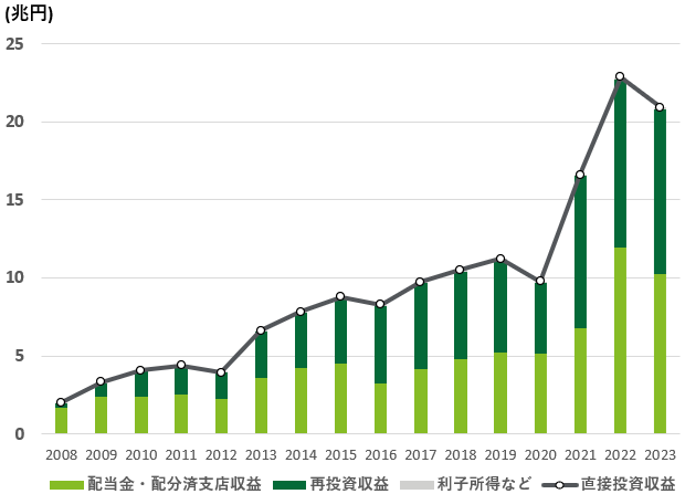 2009年度に、日本企業が海外子会社から得る配当の95%相当を条件付きで非課税とする制度(※2)が導入されて以降、海外現地法人からの受取収益は増加傾向を示してきた。それでも、日本の年間対外直接投資収益20兆円のうち10兆円近くが、再投資収益としてそのまま海外に留保され、毎年積み上がっている状況だ(図表4)。