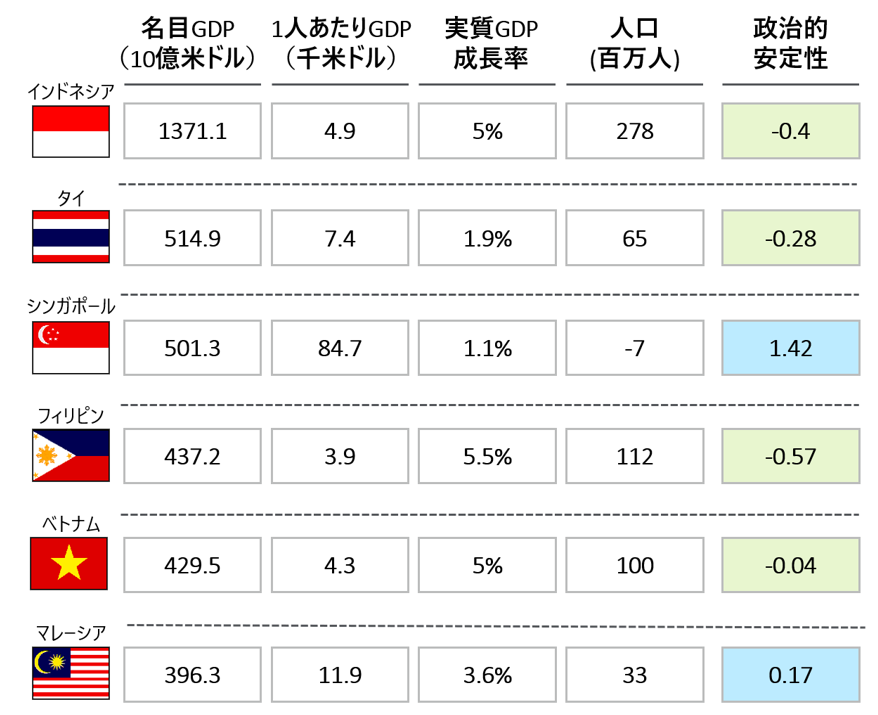 (データソース)ASEAN stats, “ASEAN Statistical Highlights 2024”,<https://www.aseanstats.org/publication/ash-2024/> World Bank, “Political Stability and Absence of Violence/Terrorism: Estimate”<https://data.worldbank.org/indicator/PV.EST>