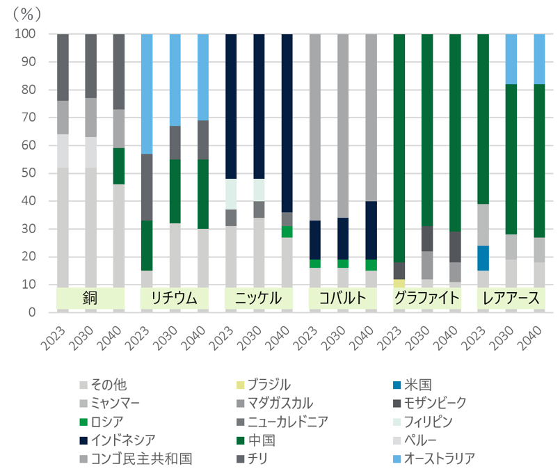 図4 主要鉱物資源の国別埋蔵量・生産量のシェアと予測(2023~2040年)