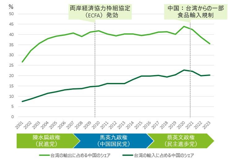 台湾と中国の関係は複雑で、政治的緊張が経済関係にも影響を与えてきた。中国は、「1つの中国」原則に基づき、台湾を自国の一部だと主張している。過去数十年、中国政府は経済関係を強化することで台湾に影響力を行使しようとしてきた。2010年には、中国と台湾は「海峡両岸経済協力枠組協定(ECFA)」を締結し、貿易の自由化を目指した。2012年には、「海峡両岸投資保障および促進協定」と「海峡両岸税関協力協定」を結び、2013年にこれらを発効している。