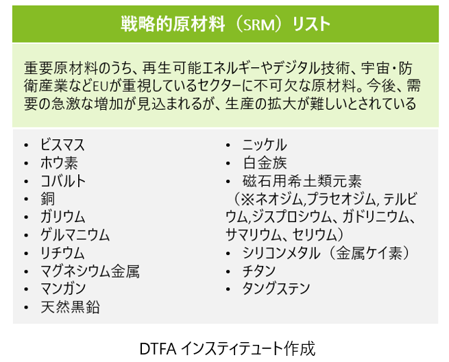 同規則案では、EU経済にとって重要であり、サプライチェーンに関連するリスクが高い原材料を特定している。EUでは2011年から重要原材料リストを作成してきたが、同規則案に組み込まれたことで、初めて法的に位置づけられた。特筆すべきは、EUの戦略的技術に重要となるが供給不足の恐れがある鉱物を対象とした「戦略的原材料(Strategic Raw Material: SRM)」という概念を新たに導入したことだ(※図2)。