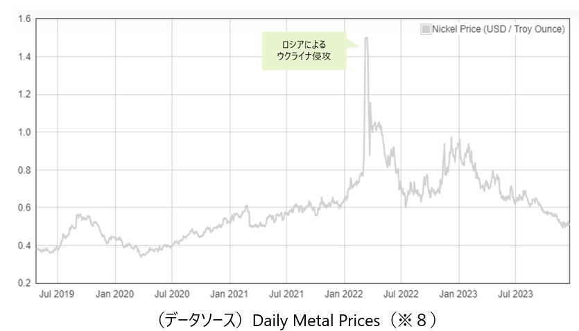 この産業構造は、特定国への過度な依存を引き起こし、供給国の政治的・経済的状況などによる価格変動リスクを伴う。例えば、2022年のロシアによるウクライナ侵攻は、EVのバッテリーなどに使われるニッケルの供給不安を引き起こし、ニッケル価格を急騰させた(※図5)。