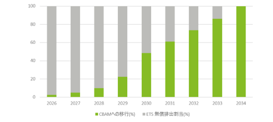 EU ETSで割り当てられている無償排出枠については、CBAMはこの無償割当に代わる制度であることから、EU ETSの無償割当枠は2026年以降、段階的に削減され、2034年には完全にCBAMに移行される見込みである(※図4参照)。