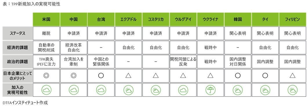 本稿では、TPPに加入申請した6カ国・地域、関心を表明した3カ国、さらに当初のTPPに合意したものの、2017年に離脱した米国について取り上げる。それぞれの経済、政治的課題などを基に、加入の実現可能性を整理すると次の表のようになる。