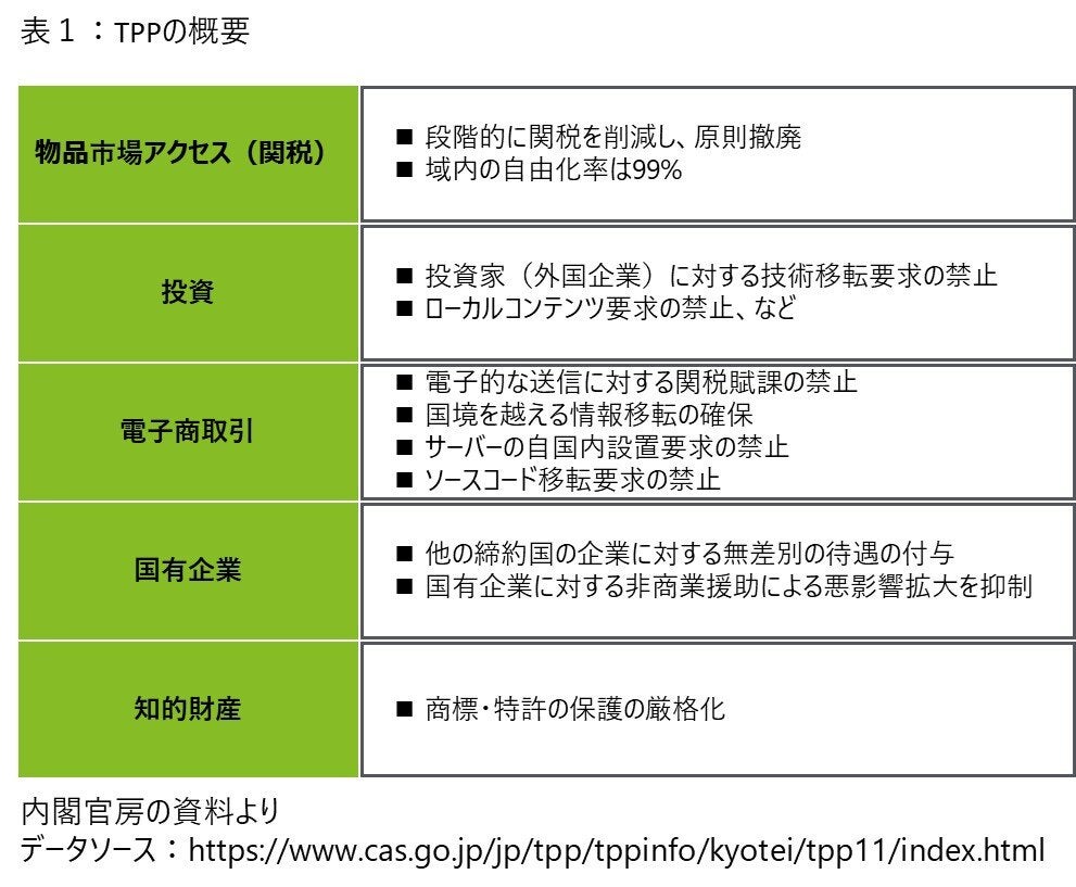 その特徴は、高水準の物品・サービス貿易の自由化にある(※2)。締結国は原則として全品目の関税撤廃を求められ、域内の貿易自由化率は99%に達する。また、高水準の知的財産の保護、データ・ローカリゼーションやソースコード移転に関する要求の禁止など先進的な措置が盛り込まれている。(表1)