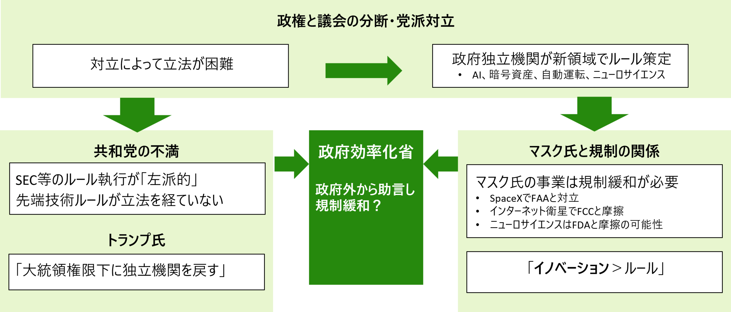 背景には、連邦政府と議会、共和・民主両党の間での政治的断絶によって立法が難しくなっていること、そして、イノベーションの加速に法制度整備が必ずしも追いついていないこと、この2点がある。政府独立機関は競争法の概念や執行権、規制を用いて、AI、プラットフォーマー、暗号資産に関する制度整備に乗り出しており、議会共和党内には立法軽視といった不満が蓄積されている。トランプ氏も公約「Agenda47」で政府独立機関の自律的な政策執行を批判し、大統領権限の下に戻すと宣言していた[xii]。