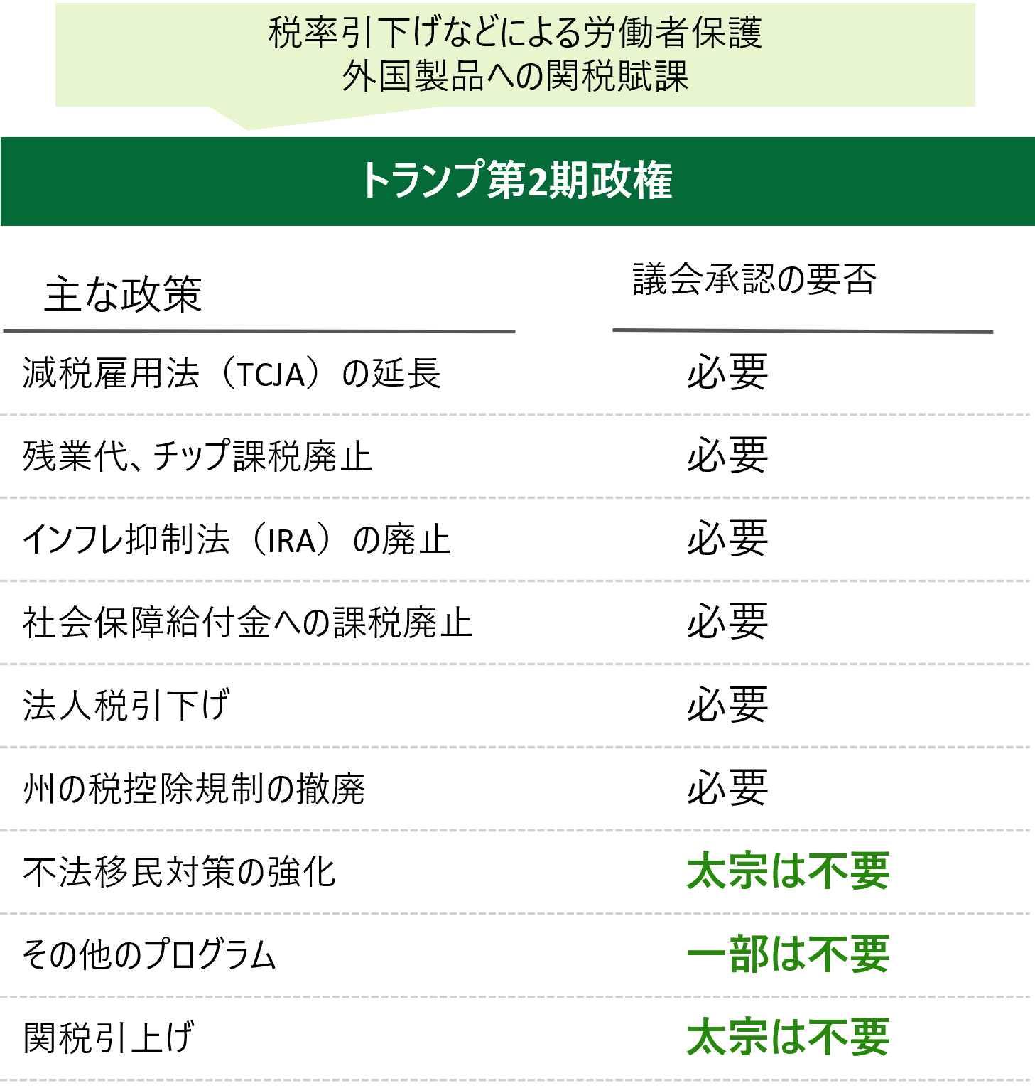 2025年以降の連邦議会は、下院共和党をジョンソン議長が引き続き主導し、上院共和党を率いる次期院内総務にはスーン氏が就任する。ジョンソン氏はトランプ氏の主張に近い一方、スーン氏は共和党穏健派とされ、トランプ氏との距離感が課題になる。また、米国の連邦議会では共和、民主両党ともに党議拘束がかからず、全ての共和党員が一致団結することはない。政権は議会との折衝を常に求められるだろう。