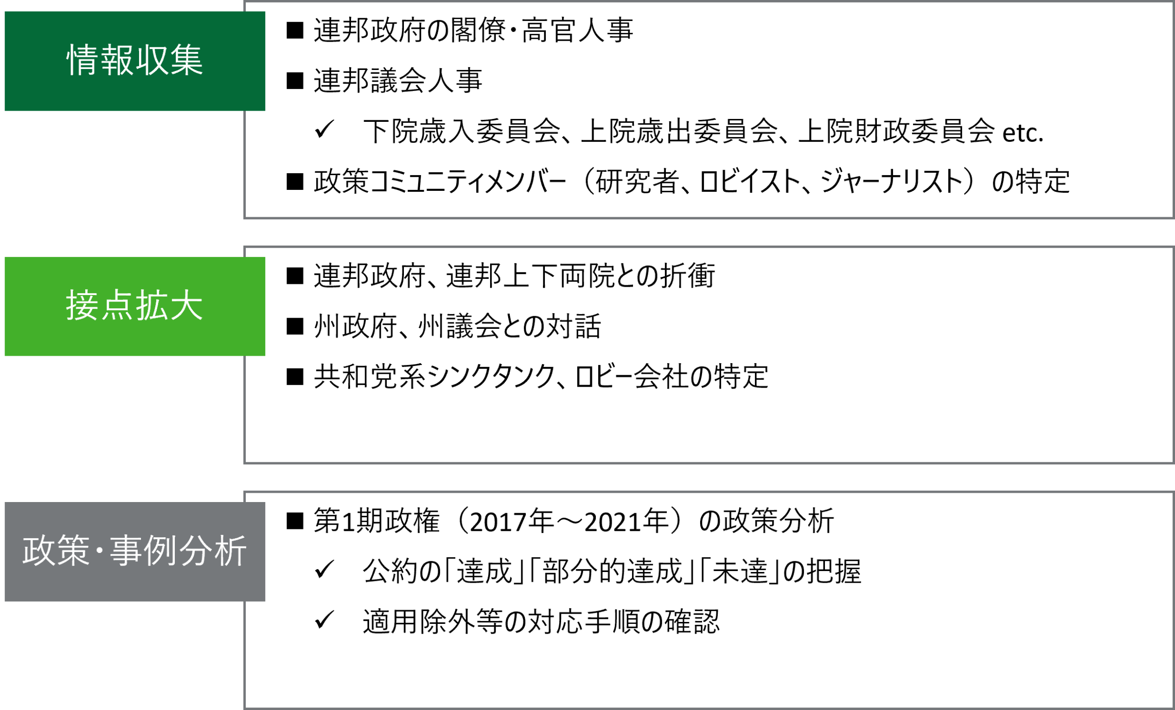 法制度的には、連邦議会の権限は引き続き強力であるが、次期政権が議会を弱体化させながら、大統領権限を強化し続ける可能性はある。米国の政策決定の力学が変わった場合、米国での事業、研究、さらにはグローバルなルールや貿易・サービス、ビジネス慣行に影響が及ぶだろう。米国政治がさらに不安定になるリスクを含め、その行方を注視すべきである。