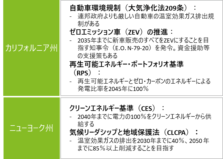 米国においては州政府の権限が強く、環境・エネルギー規制ではカリフォルニア州やニューヨーク州など海岸部のリベラルな州が連邦政府とは異なる政策を実施しているケースも多い。政権交代が起きた場合、連邦政府は環境・エネルギー規制を緩和する方針に切り替わるため、リベラルな州が独自の権限を使って州レベルで既存の環境政策や規制を維持させる可能性が高い。(図表2)