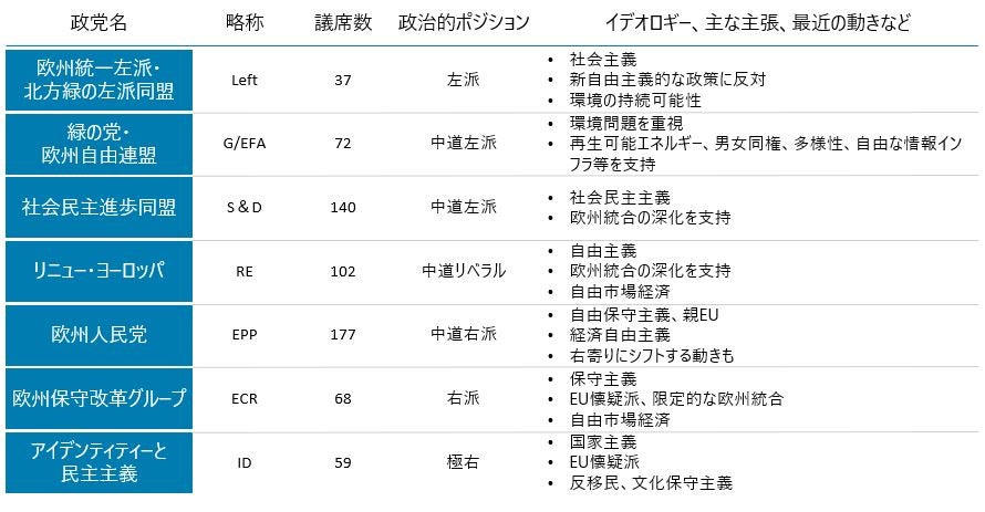 Ø EUの主要政党が勢力を保てば、フレンドショアリングを念頭に置いた産業政策や、気候変動対策と経済成長の両立を掲げる欧州グリーンディールなど、これまでの路線が継続される一方、懐疑的な右派政党が勢力を伸ばし、右傾化が加速すれば、各国が、独自の保護主義的な措置、環境政策、消費者保護などを講じることで、グローバルにビジネスを展開する企業の負担は増加する恐れがある