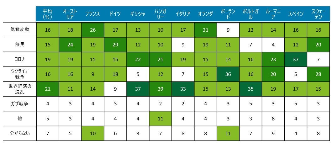 ヨーロッパ外交評議会(ECFR)の調査によると、EU市民にとっての最大の課題は、移民問題よりもむしろ、経済問題、コロナへの対応、そして気候変動だ。欧州は、過去十数年間、金融不安(欧州債務危機)、難民危機、新型コロナウィルスのパンデミック、ロシアによるウクライナ侵攻、そして気候危機などに直面してきたためだ。(※図7参照)。