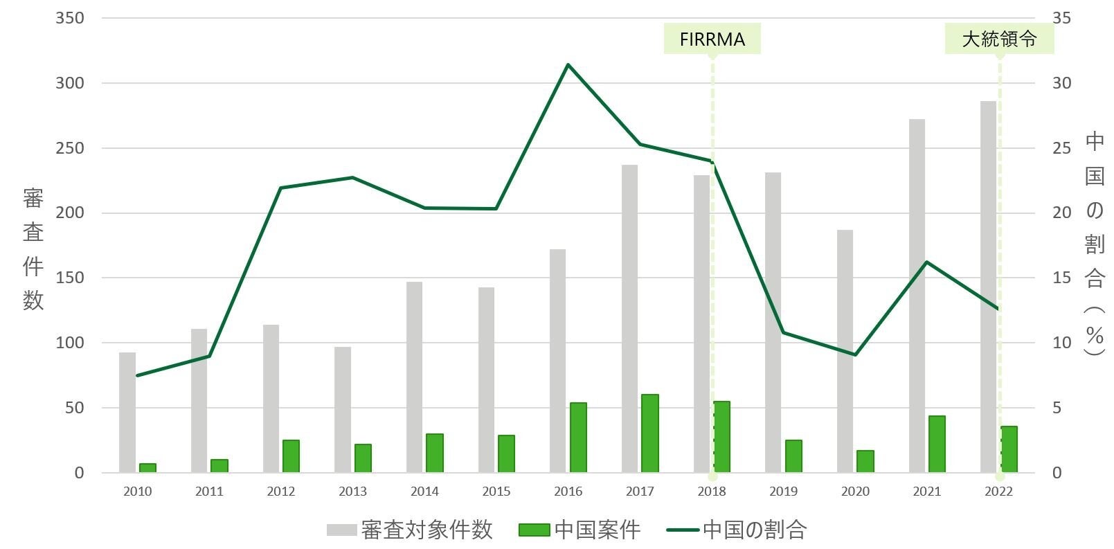 しかし、中国の台頭、またAI(人工知能)や先端半導体などの軍民両用技術の重要性の高まりを受け、米国では中国政府の指導下にある企業(中国国営企業を含む)からの対米投資への警戒が強まった(※8)。中国による米国の技術獲得やそれの軍事利用を防ぐためには、CFIUSのアップデートが必要だという声が米国議会で高まり、2018年8月に外国投資リスク審査現代化法(FIRRMA)が成立。CFIUSの権限は大幅に強化された。また、CFIUSの審査対象範囲も拡大している。