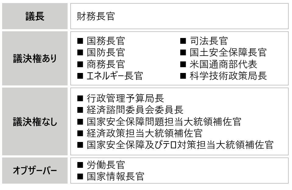 CFIUSは、米国への外国投資が米国の「国家安全保障」上の脅威となるか審査する省庁間委員会である(※図3参照)。また、必要に応じてその取引を阻止する権限を有している。「国家安全保障」の確たる定義はなく、審査対象となる取引の判断はCFIUSに委ねられている。そのため、米国の対内投資審査における「国家安全保障」の定義は、時折の安全保障環境や政治的要因によって変化してきた(※6)。
