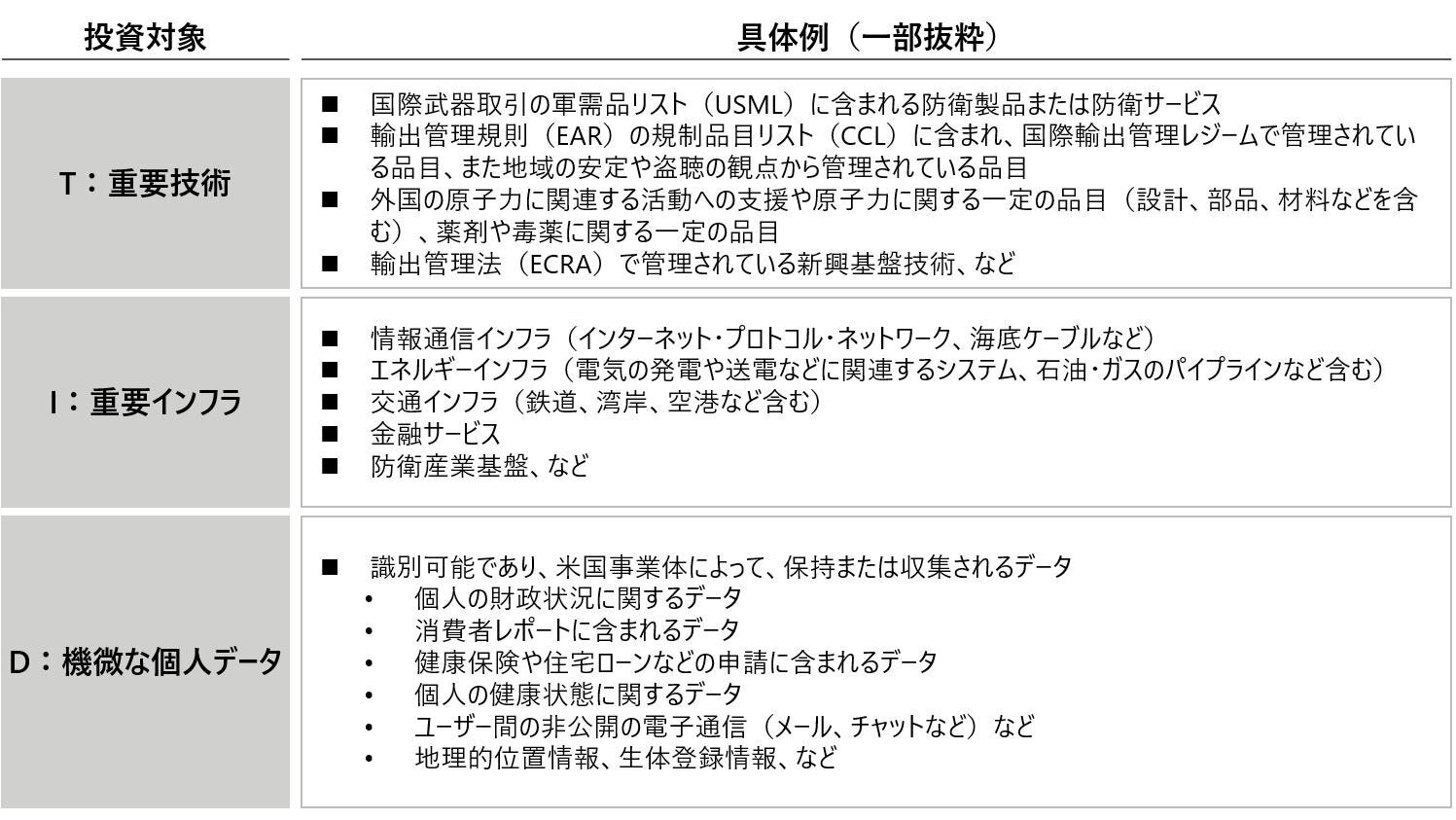 (1)②対象投資は、外国人による投資が「支配」をもたらすものではないが、「TID米国事業(TID U.S. Business)」との取引を指す。「TID米国事業」とは、「T」:重要技術(critical Technology)、「I」:重要インフラ(critical Infrastructure)、「D」:米国市民の機微な個人情報データ(sensitive personal Data of United States citizens)を扱う事業である(※11、図4参照)。