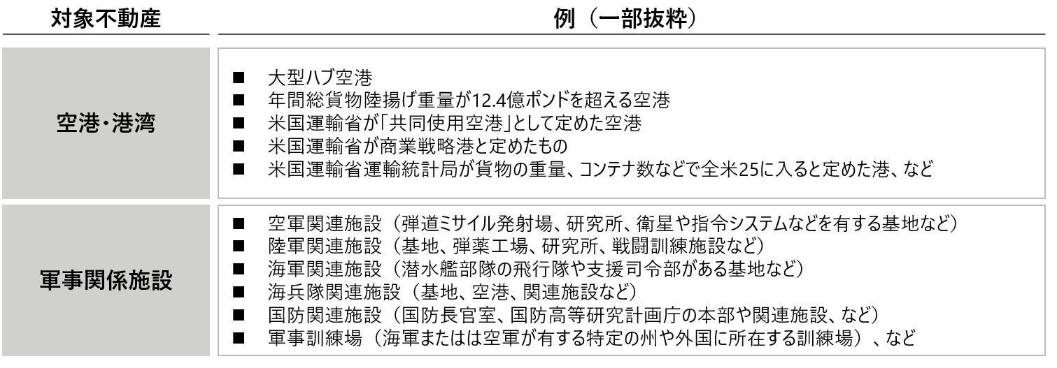 (2)対象不動産取引は、米国内にある、①空港または港湾に位置する、もしくはその一部として機能する、または②米国軍施設など安全保障上の観点から重要な政府施設などに近隣する不動産取引を指す(※図5参照)。不動産取引は、FIRRMAで新たに審査対象として加わった。