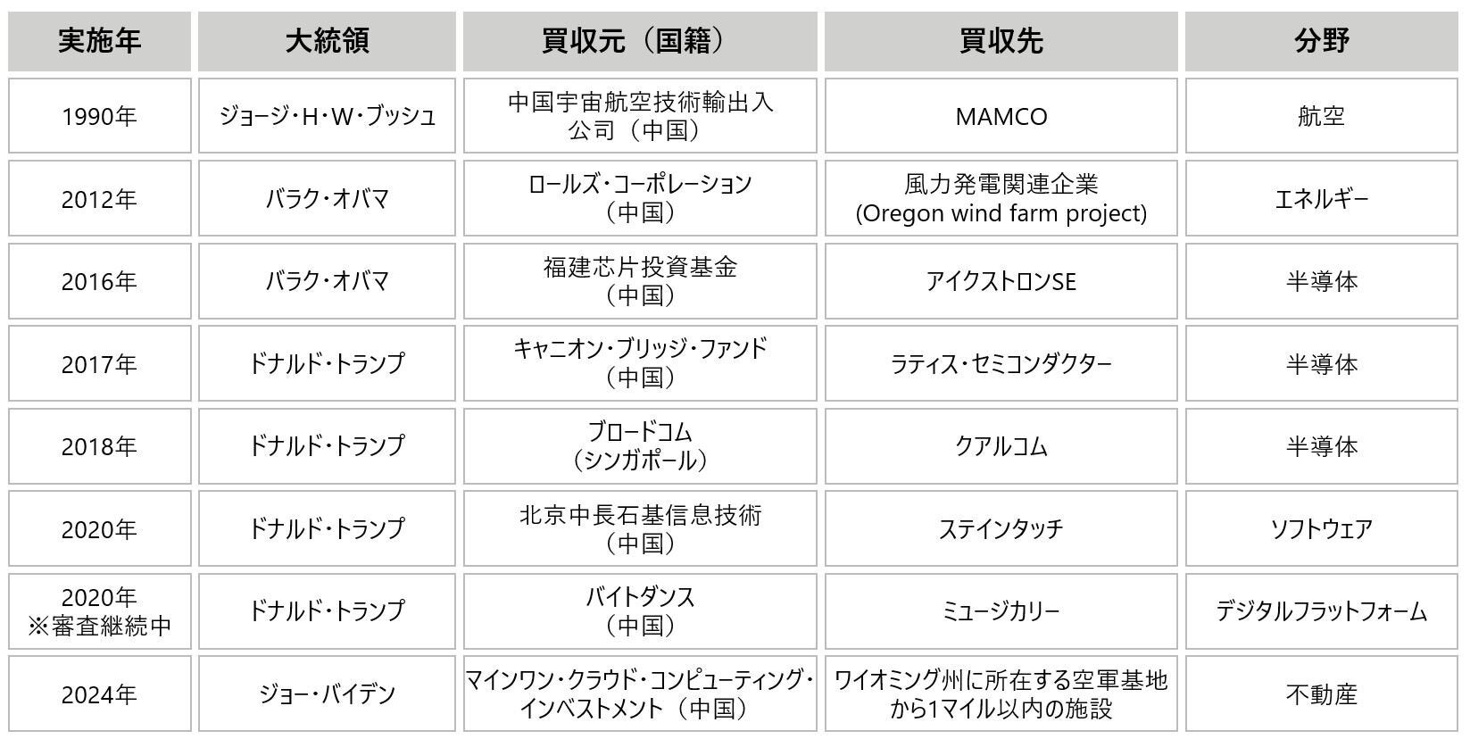 大統領は、報告を受けてから15日以内に取引の承認可否について決定する。これまでの大統領令による取引差止事例は、図表6の通り。