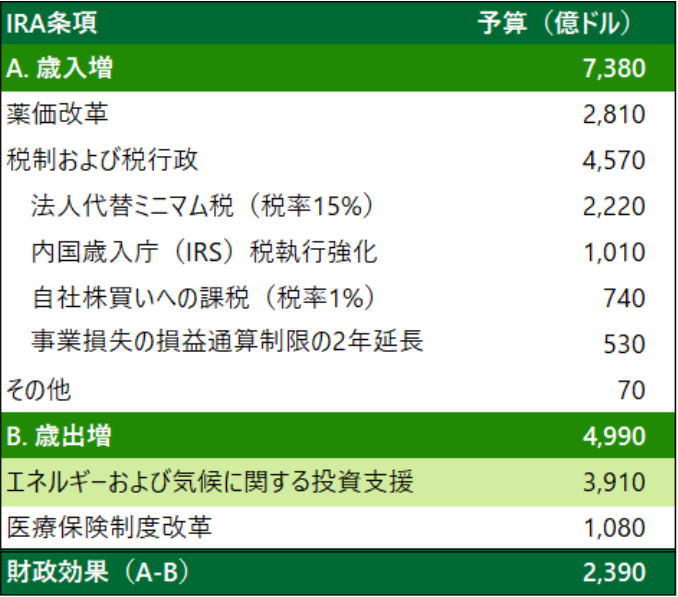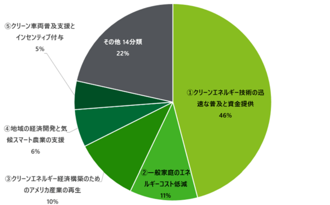 図表1の歳出項目のうち3,910億ドルが、主に気候変動対策とクリーンエネルギー支援を対象とした投資となる。バッテリー部品や再エネなどの生産に対する税額控除(PTC)、設備投資に対する税額控除(ITC)、EV充電施設と送電網の強化などのエネルギーインフラの整備への支援、一般家庭における省エネ支援、脱炭素への移行に向け産業を強化することへの支援などのクリーンエネルギー投資が、この中に含まれる(※3)。また、先住民など社会的に不利な立場に置かれた人々への支援の強化、自然生態系の保護や農業における気候変動対策の推進、気候変動への適応、研究や観測体制の強化など、136件にも上るプログラムに資金提供を行う。