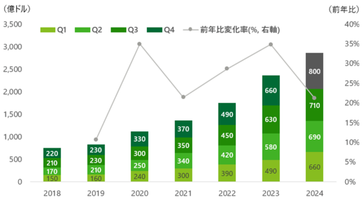 注:2024年第4半期の投資額(灰色)は、2024年第1-3四半期における前年同期比変化率を用いてDTFA Instituteが算出した。