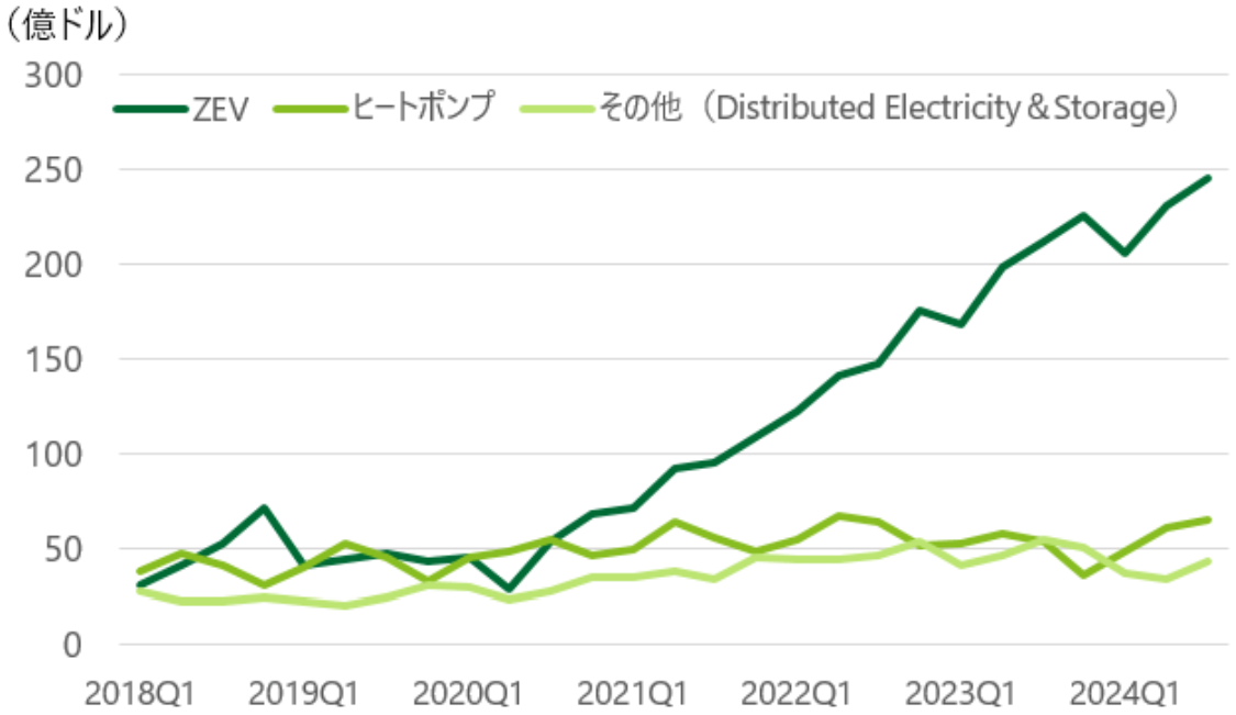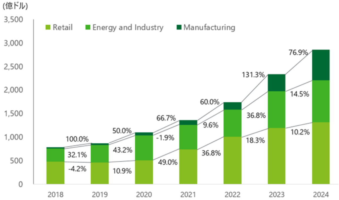 注:CIMは、”Clean Investment”を固定資本形成と耐久財購入として定義し、家庭および企業におけるGHG削減技術の導入(Retail)、クリーンエネルギー生産および脱炭素生産のための技術配備(Energy and Industry)、GHG削減技術に基づく製品の製造(Manufacturing)の3つの投資セグメントに分類している。数値は各セグメントにおける前年比変化率を示す。2024年第4四半期の投資額は第1-3四半期における前年同期比を用いてDTFA Instituteが計算した