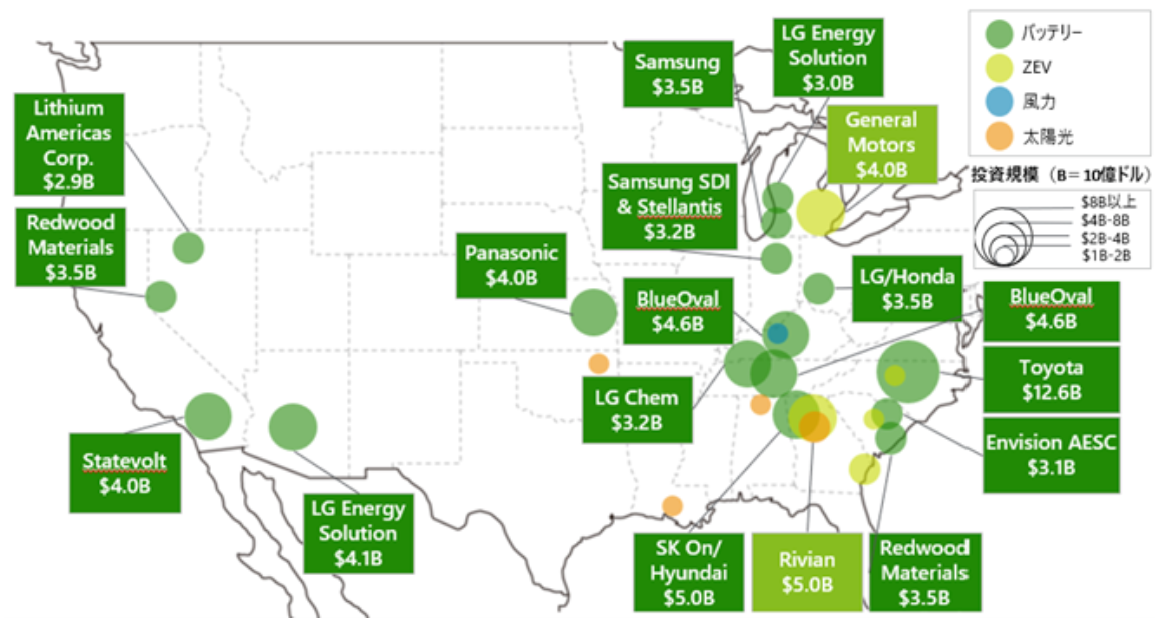 米南東部のバッテリーベルトは歴史的に自動車産業が集積する地域であり、サプライチェーン上の優位性が存在する点も指摘されている。州政府以下の地方政府が付与する金銭的インセンティブ(税額控除、補助金など)も国内外の企業の投資決定に影響を与えている可能性がある。