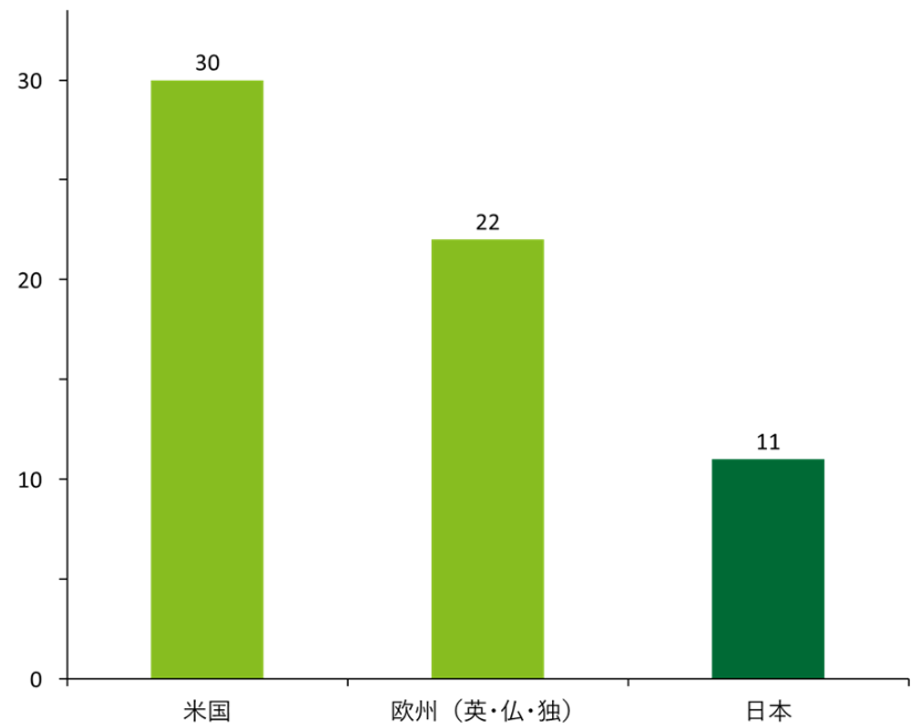 ただし、中堅企業には「成長の屈曲点」が存在すると指摘される[iv]。日本では、2011年度から2021年度までの10年間で中堅企業から大企業へと従業員規模が成長した企業の割合が米欧先進国と比べて低かった。(図表1)
