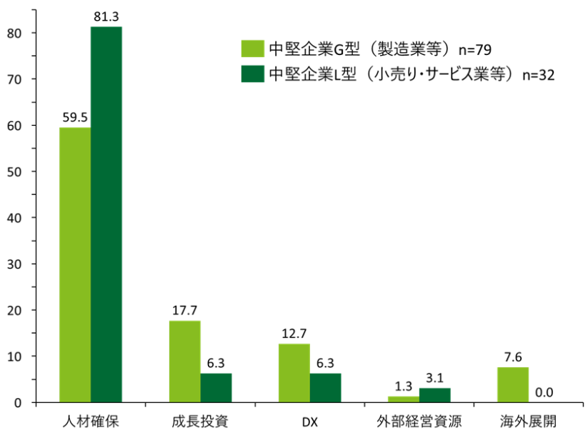 多くの中堅企業は人材確保において成長の屈曲点に直面している。経済産業省が2023年に取りまとめた調査では、地域活性化に意欲的な中堅企業が挙げる「今後の成長の課題」は人材確保が首位だった。(図表2) デロイト トーマツ グループが2024年に中堅企業を含むミドルマーケット企業群に実施した調査でも、同様の課題感が明確に表れた[vi]。