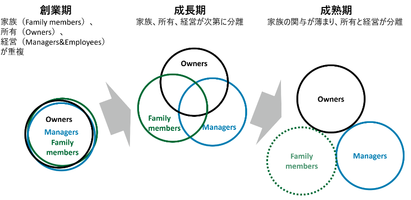 米国研究者によるファミリービジネスの「3つのサークル(家族、所有、経営)モデル」に基づくと、成長期にある中堅企業は家族(Family members=創業家)、所有(Owners=株主)、経営(Managers&Employees=役員・社員)が徐々に重なり合わなくなるため、新たなガバナンスの構築や調整が必要になる[xiii]。(図表4)