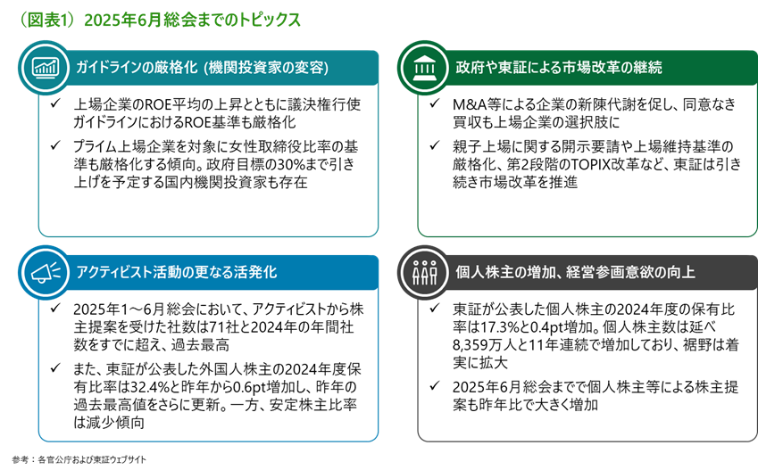 上場企業を取り巻く環境は年々厳しくなっており、市場との対話の重要性は高まっている。2025年6月の株主総会までのトピックスは「ガイドラインの厳格化」「政府や東証による市場改革の継続」「アクティビスト活動の更なる活発化」「個人株主の増加、経営参画意識の向上」であった(図表1)。