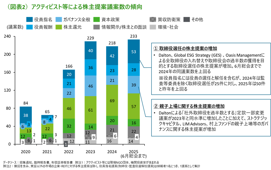 注目すべきは取締役の選任解任が増え、親子上場のガバナンスについての提案も増えていることだ(図表2)。取締役の選解任については、アクティビストが提案した代表の選任を求めるケースや、機関投資家がアクティビストの株主提案には賛成しないものの、会社提案にも反対した事案もあった。社外取締役が株主に積極的に説明することも求められている。
