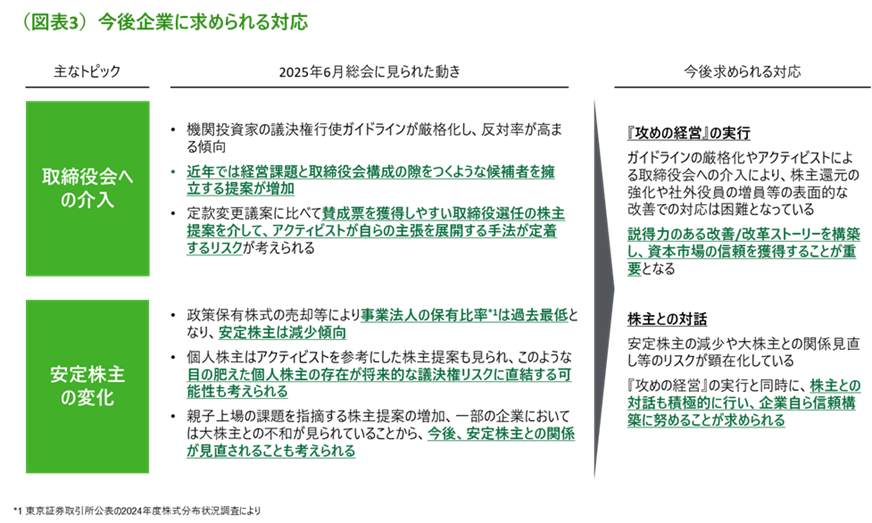 2025年の6月総会での主なトピックは「取締役会への介入」と「安定株主の変化」の2つであった。アクティビストへの対応は難度が高まっている(図表3)。「攻めの経営」によって自律的で説得力のある改善や株主と積極的に対話し、資本市場の信頼を獲得することが重要となる。