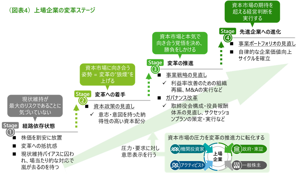 ステージ1は変革ができずに株価が割安でアクティビストから何度も何度も株主提案を受け、非常にリスクがある状態。ここから抜けるのがステージ2だが、まずは資本政策見直しが取り組みやすい。ステージ3の事業戦略見直しやガバナンス改革は痛みを伴うので、まずは資本戦略見直しで変革の狼煙(のろし)を上げる形だ。