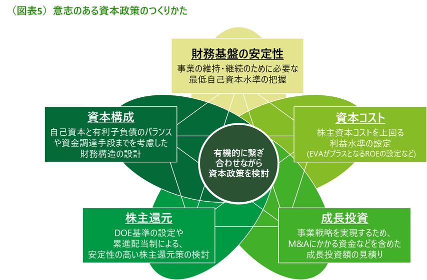ステージ2における「意志ある資本政策」に必要な要素は5つある(図表5)。財務基盤の安定性については、今の経営状態を維持するにはどれぐらい自己資本が必要なのかなど、現状を疑って考えるのが重要。資本コストについて、市場から要求されている水準はもっと高いのではと疑うことも重要。成長投資と株主還元のバランスに関しても、財務基盤の安定性や資本構成などを有機的につなぎながら資本政策を検討する必要がある。
