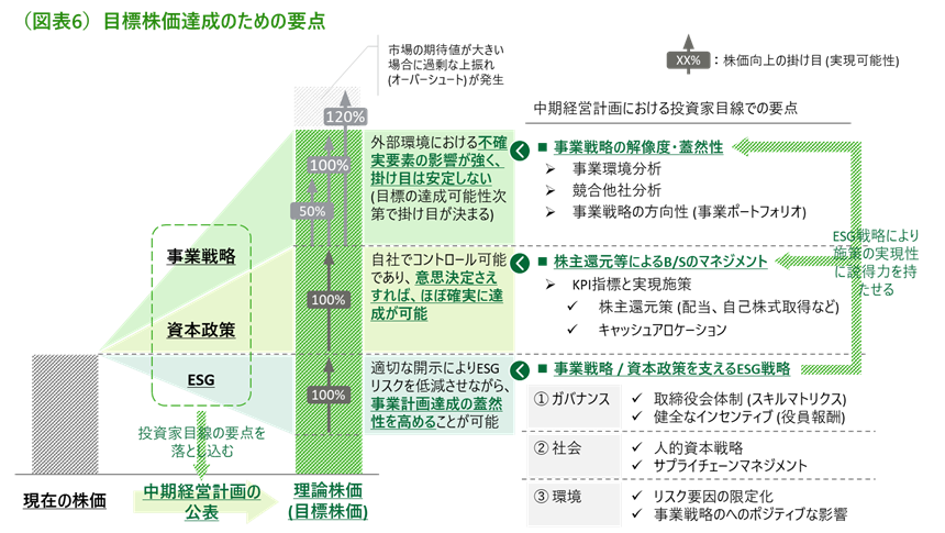中期経営計画を公表してきっちり株価を上げるためには何が必要か説明したい(図表6)。中計の3大要素である事業戦略と資本政策とESGのうち最も重要なのは事業戦略である。しかし、事業戦略には必ず、環境変化などによる不確定要素が入ってくる。このため、(達成率のパーセンテージである)「掛け目」がかかって(成果を)受け取る形になる。事業戦略の掛け目を100に近づけるには解像度や蓋然性の向上が欠かせない。このため、事業環境の状況や競合他社に対する強みを(中計に)追加的に盛り込む必要がある。