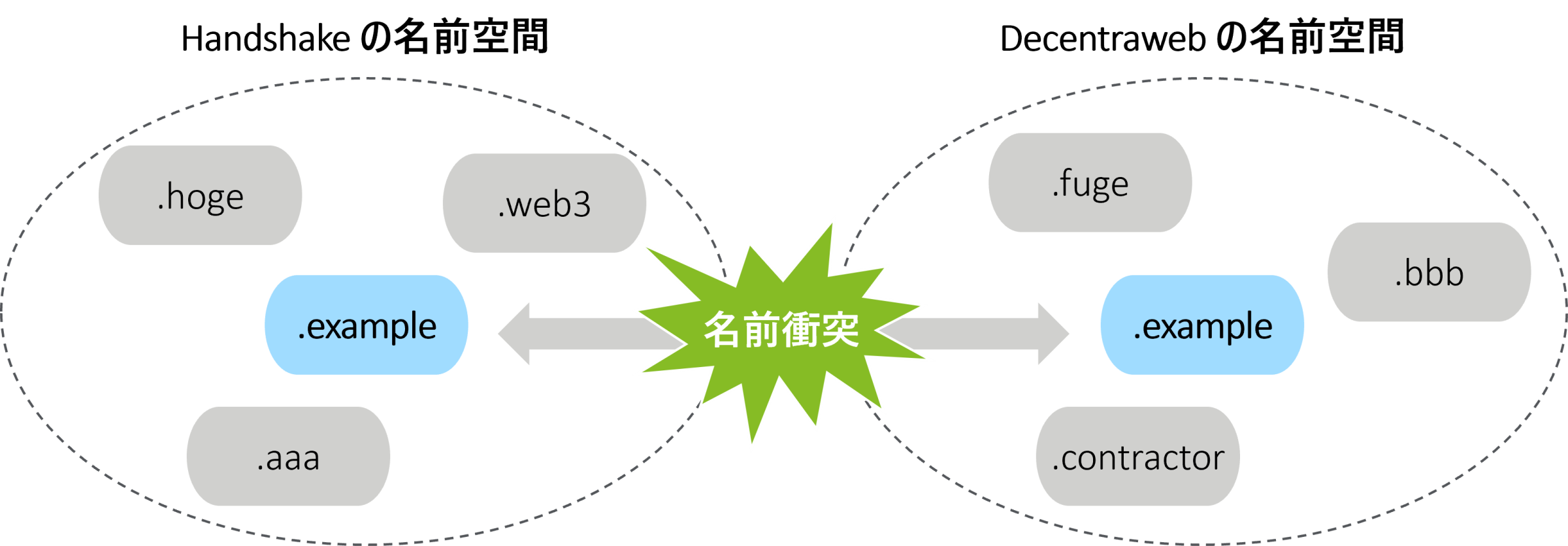 ドメイン名が重複する「名前衝突」は、ICANNが管理するWeb2.0時代のインターネットでも懸念されてきた。既存の組織内ネットワークで使われるドメイン名と、ICANNが設定したインターネット上のドメイン名の間で、同じ文字列が使われた結果、通信障害を引き起こした事例がいくつか報告されている。