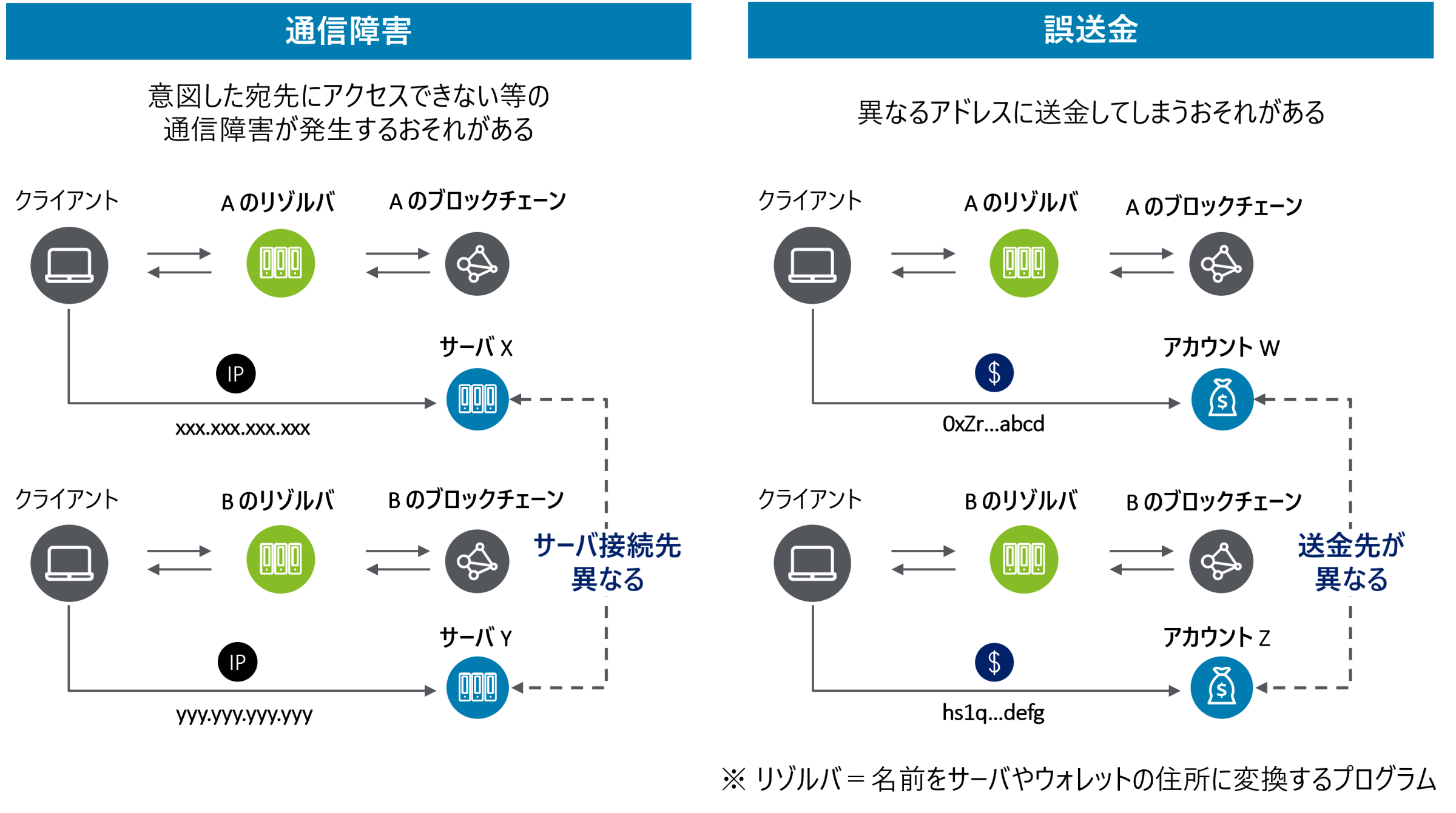 Web3時代のブロックチェーン・ネーミング・サービス(BNS)は分散構造であり、利用者がドメイン名の文字列を自由に更新・管理できるのが特徴である。その結果、Web2.0時代のDNSよりも、同じアドレスが登録される名前衝突が起きやすくなっている。当然、Web2.0時代同様に、名前衝突による通信障害やデータ流出、データの詐取などのリスクも懸念される。(図表2)