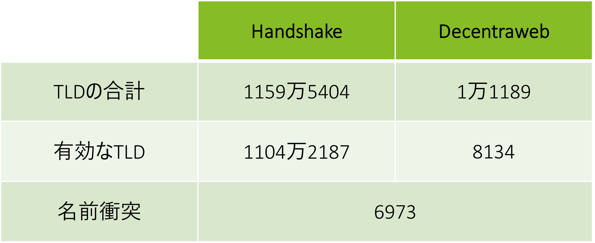 2023年7月27日~8月10日に収集したデータに基づくと、Handshakeには1159万5404件のTLDが設定されていた。一部は期限切れといった理由で無効になっており、有効なTLD数は1104万2187件だった。また、Decentrawebには1万1889件のTLDが設定され、そのうち有効なものは8134件だった。
