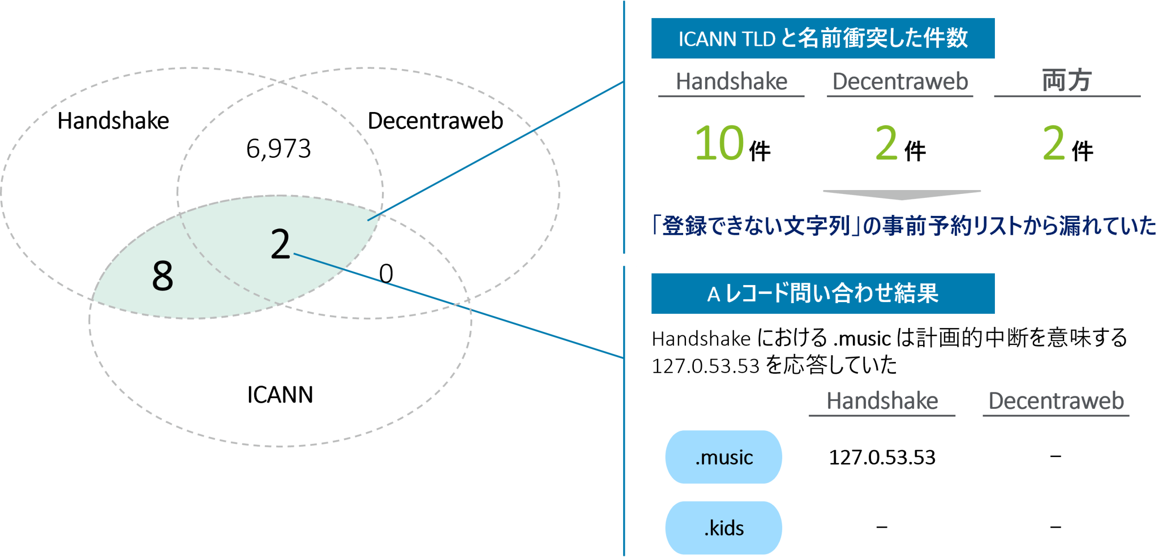この結果、Handshakeと従来のDNSの間では10件、DecentrawebとDNSの間では2件のTLDが重複していることが判明した。「.music」「.kids」というTLDは、2つのBNSとDNSのいずれにも登録されていた。(図表5)