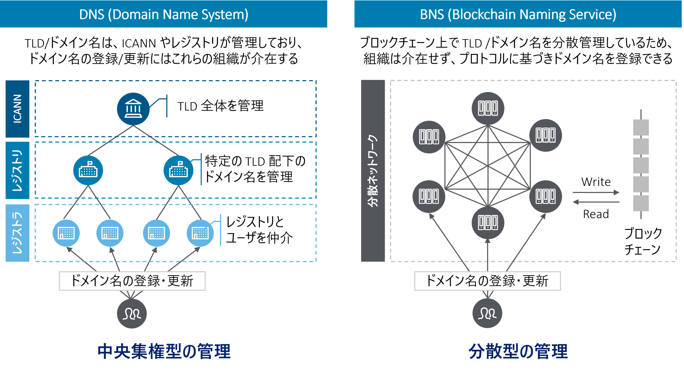 このWeb3的な取り組みは、情報や資産の管理だけではなく、ネット上の住所=ドメイン名の管理においても広がっている。Web3におけるTLDの運用は、ICANNを頂点とした中央集権的な構造のDNSとは異なるものだ。ドメイン名がブロックチェーン上で管理されるため、個々のネット利用者が好みの文字列を容易に登録・更新できる。この仕組みはブロックチェーン・ネーミング・サービス(BNS=Blockchain Naming Service)と呼ばれ、「分散型の構造」を取っていることが特徴である。(図表1)