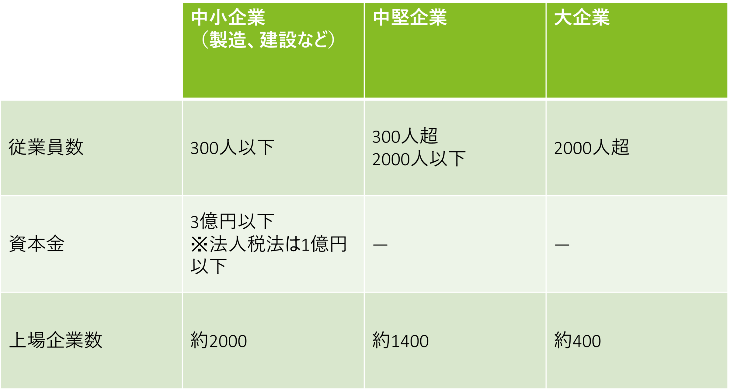 これまで、中小企業基本法では、製造業・建設業・運輸業などの場合、「従業員300人以下」あるいは「資本金・出資金3億円以下」の企業を中小企業と位置付け、それ以上の規模の法人を「大企業」と扱っていた。卸売業、サービス業、小売業と業種別に中小企業を定義してあるが、ここでは省略する。