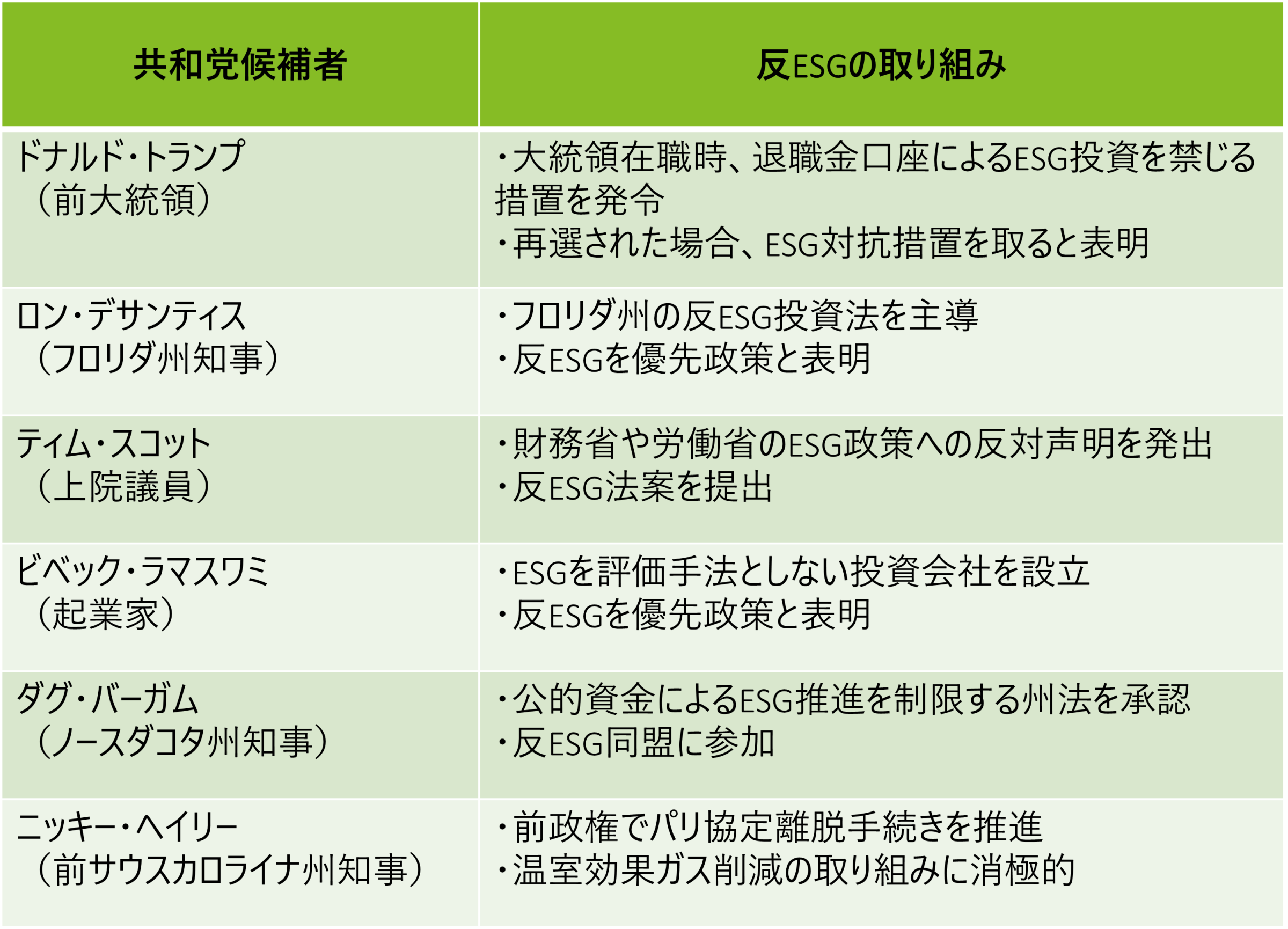 いずれの候補であっても、2024年の大統領選を共和党が制した場合、翌年に発足する政権がパリ協定から再離脱したり、ESG投資を抑制したりする政策に向かう可能性は高いと見られる。