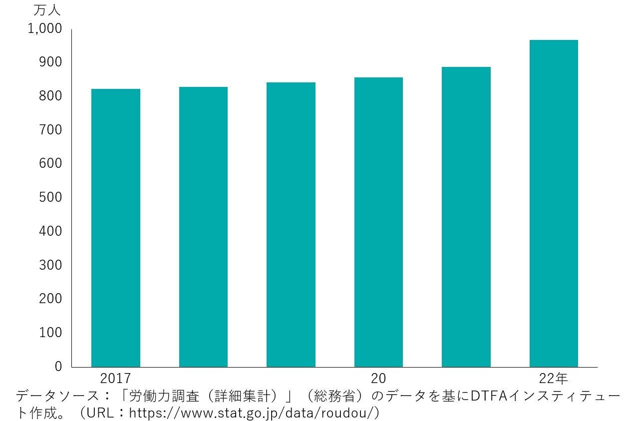 働き手の転職への関心は高まっている。労働力調査の「転職等希望者」は2022年平均で968万人にのぼる。5年前に比べ、17%増えた。転職等希望者は「現在の仕事のほかに別の仕事もしたい」という人も含まれているため、すべてが純粋な転職を希望しているわけではないが、一つの会社にこだわらず多様なキャリアを志向する人の増加がうかがえる。