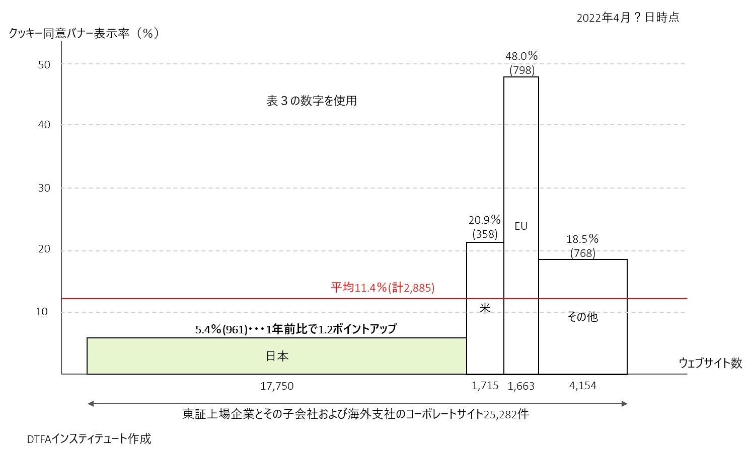 法施行直後の2022年4月時点で、日本国内サイトの表示率は5.4%にとどまっていた。1年前からの増加はわずか1.2ポイントだった。これに対して米国内サイトは20.9%、EU域内サイトにいたっては48.0%と高率である。特にEUでは2018年5月に施行された一般データ保護規則(General Data Protection Regulation, GDPR)が、ウェブサイト閲覧履歴を含む個人に関するあらゆる情報が個人情報であると定義している影響が顕著に表れている。