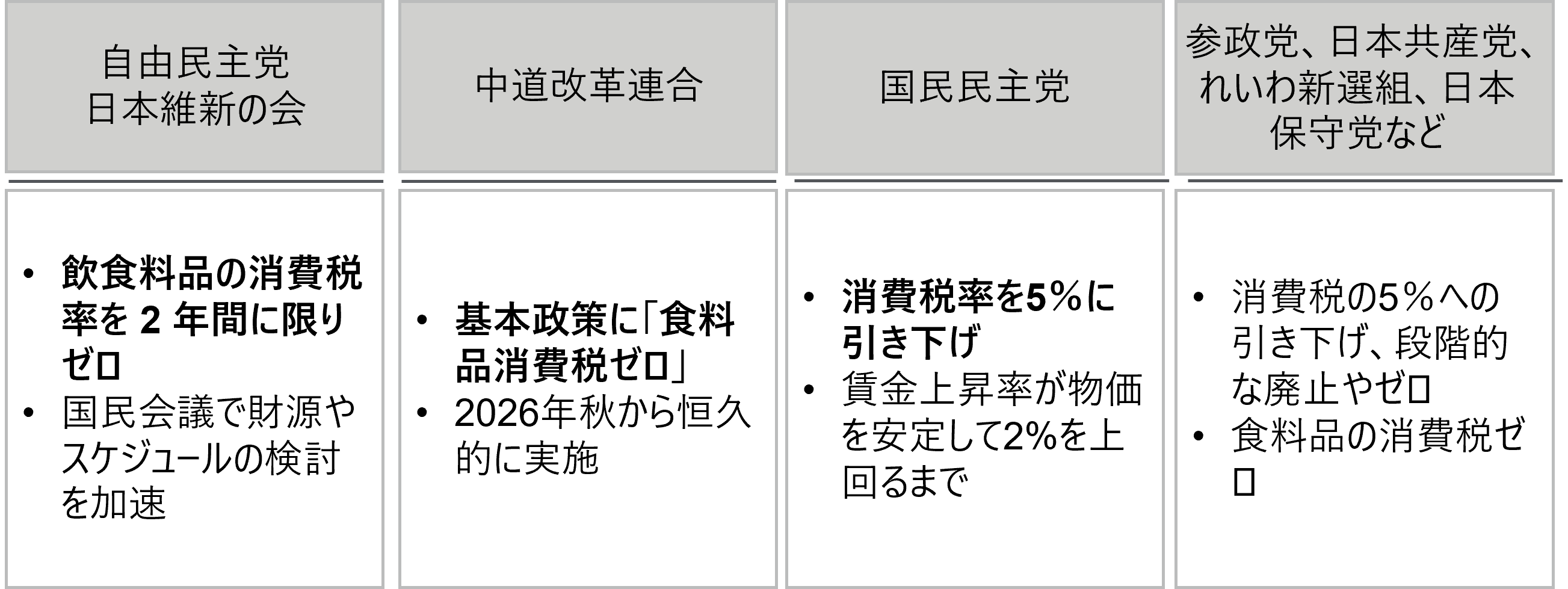 2月8日の投票に向けた論戦がスタートした。物価上昇が続き、消費者の生活防衛志向が続く中で、物価高対策が主要な争点の一つである。1月26日現在、図表1に見るように、与野党の大多数が「食料品の消費税ゼロ」を公約に掲げている。どのような投票結果になるにせよ、何らかの形で食料品減税の検討が進む可能性が高まっている。