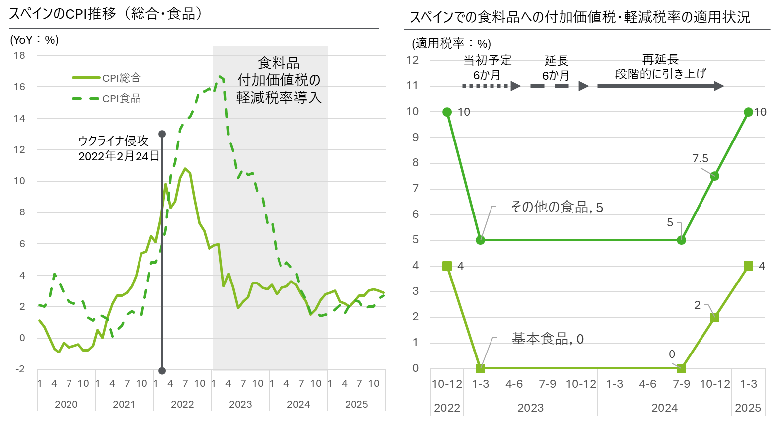 スペインでは財とサービスの性質によって、付加価値税(IVA:Impuesto aobre el Valor Añadido)が標準税率21%、軽減税率10%、超軽減税率4%の3種類に分かれている。嗜好品などは標準税率、交通費、外食、食品の一部などには軽減税率が課される。そして新聞、医薬品のほか、生活必需度の高い「基本食品」であるパン、牛乳、野菜などには超軽減税率が適用される[3] 。図表2左で示すように、2022年のウクライナ侵攻を機に進行したインフレへの対策として、食料品への軽減税率が導入された。当初、2023年1月1日から半年の時限措置として導入されたが、図表2右のように、その後インフレ継続を受けて再三延長され、2024年12月まで、基本食品は4%→ゼロ%、その他食品は10%→5%とする軽減税率を適用した。