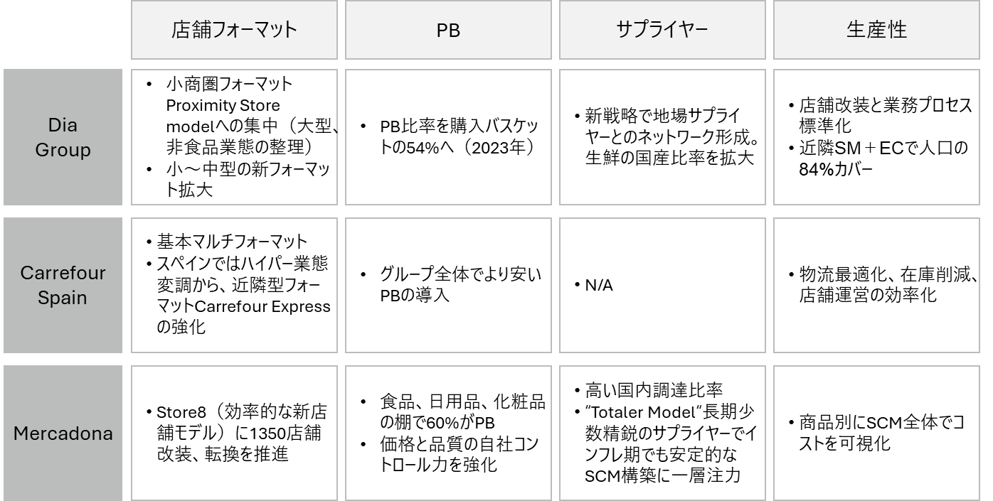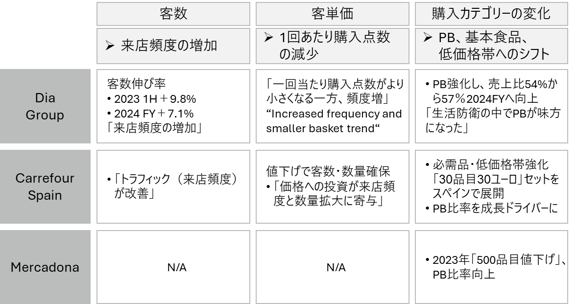 (データソース)Dia Group、Carrefour各社のFY2023からFY2025のQuarterly Resultsでのスペイン事業にかかる各社コメントから関連するものを抜粋、Mercadonaは非上場のためニュース記事と開示資料